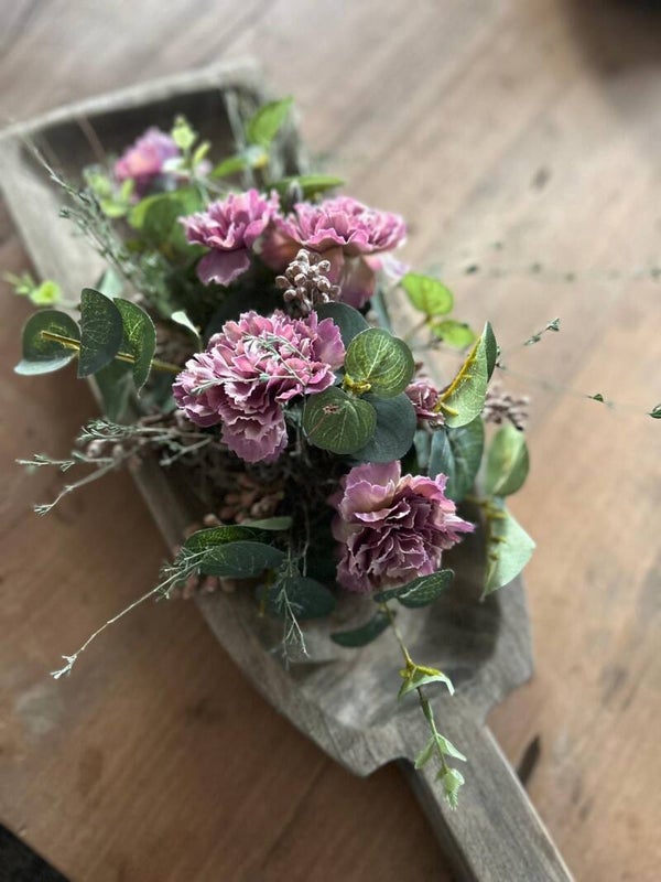 Mooi bloemstuk van kunst-anjers en kunst-eucalyptus 🌸🌿 op een mooie houten tray.